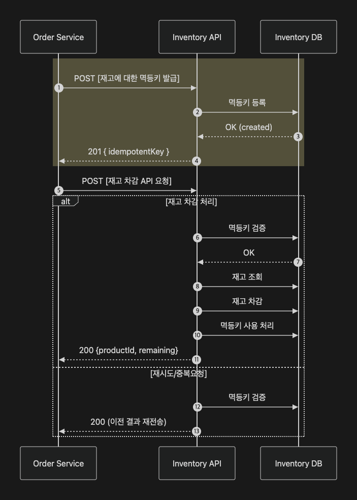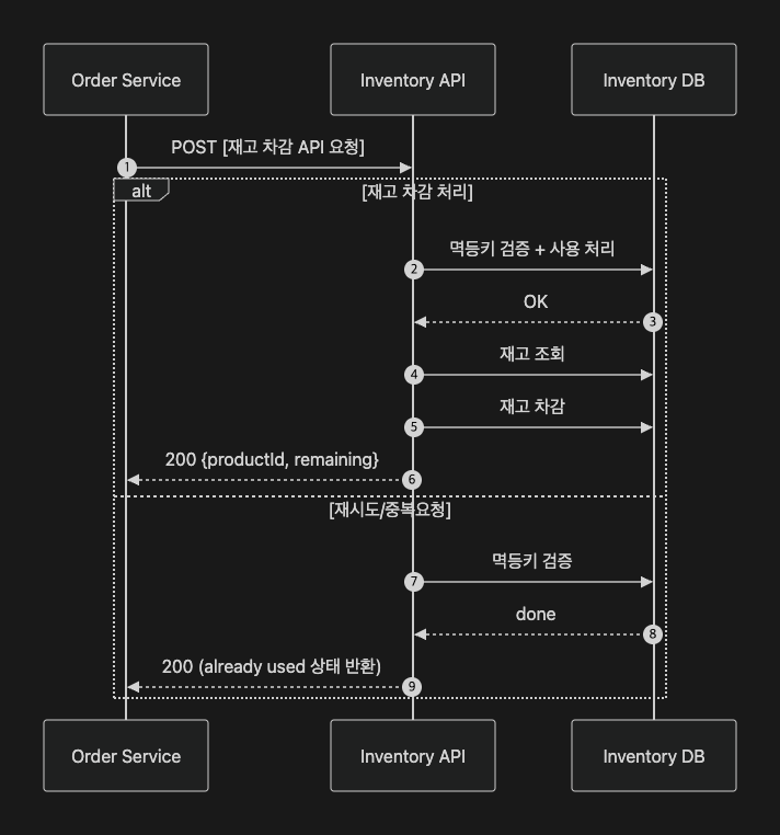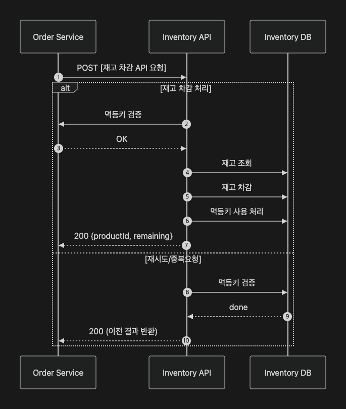 - 주문 서비스는 멱등키와 재고 정보를 포함하여 재고 차감/증가 API 요청