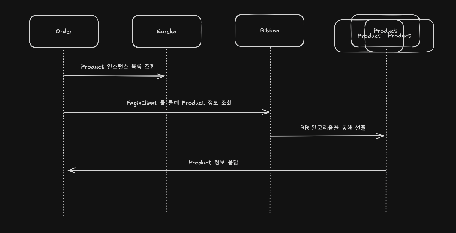- 클라이언트(예: 주문 서비스) 가 레지스트리(Eureka) 에게 대상 풀을 직접 조회하고