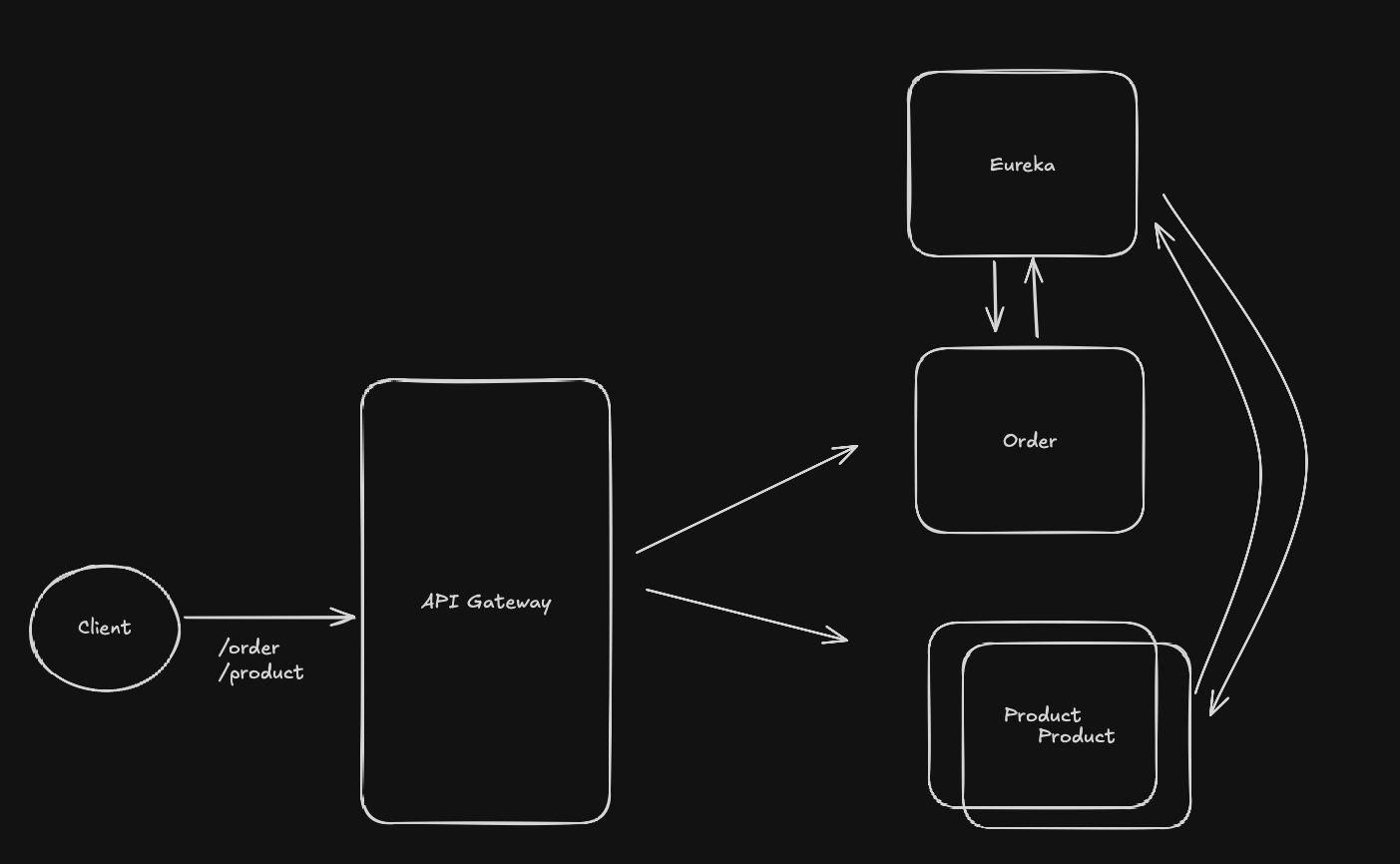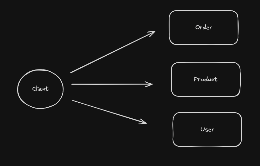 - Client 가 주문(Order), 상품(Product), 유저(User) 에 대해서 사용해야 한다고 가정 및 각 도메인은 MSA 화 되어있다