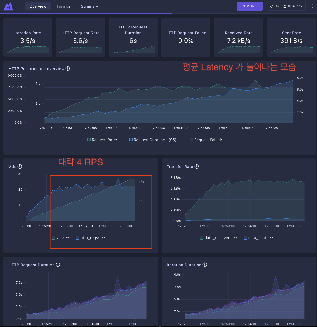 - 가용가능한 RPS 를 넘어가면 점점 평균 Latency 시간이 늘어남