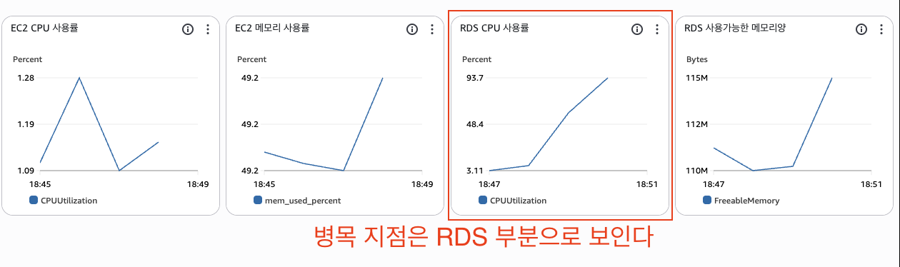 - 각각 지표를 확인한 결과 4 RPS 지점에서 RDS 의 CPU 사용률이